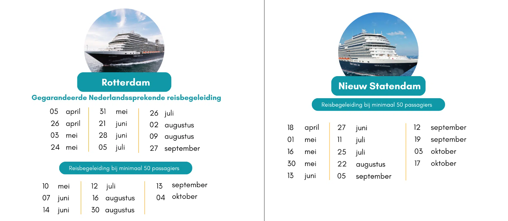 Onze reisbegeleiding in 2024 was een groot succes, daarom zal Captain Cruise ook in 2025 ervaren Nederlandssprekende reisbegeleiding mee laten gaan op alle 8-daagse cruises van Holland America Line met vertrek vanuit Nederland*