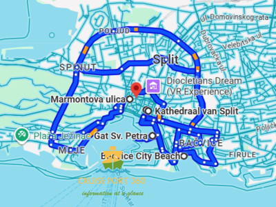 De cruisehaven van Split ligt op slechts 800 meter van het historische centrum. Je loopt in ongeveer 10 minuten naar de Riva-boulevard en het Paleis van Diocletianus.