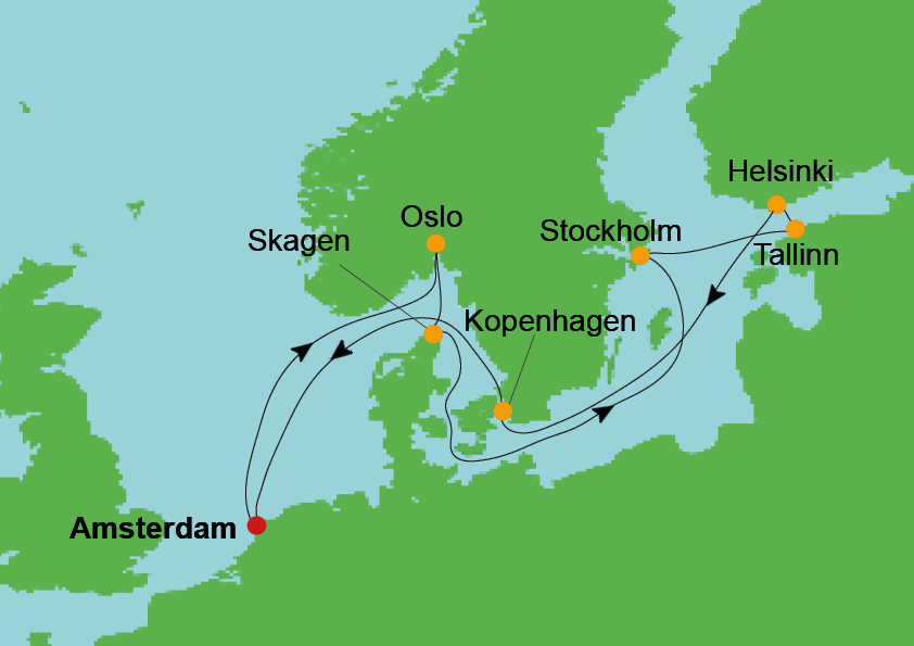 Veel cruises vertrekken vanuit Nederland (Amsterdam of Rotterdam) en Duitsland (Kiel of Hamburg).