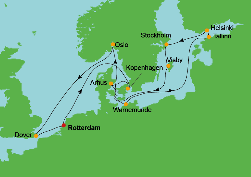 Tallinn (Estland), Riga (Letland), Klaipėda (Litouwen), Helsinki (Finland), Stockholm (Zweden) en Kopenhagen (Denemarken).
