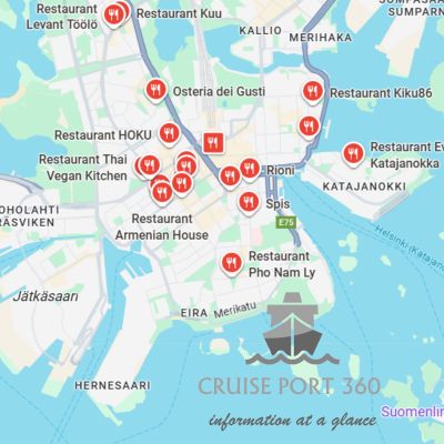 → Afhankelijk van de terminal: er rijden vaak shuttlebussen. Vanaf Hernesaari en West Harbor is het centrum met de tram (lijn 7 of 9) in ca. 15–20 minuten bereikbaar. Taxi duurt ca. 10 min.