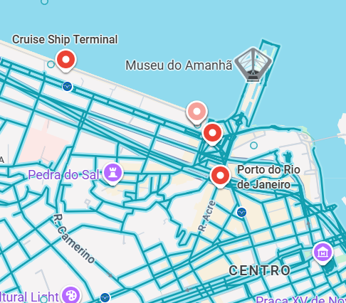 Nee. Cruiseschepen meren aan in de moderne haven Porto Maravilha, vlak bij het centrum en de iconische boulevard Boulevard Olímpico.